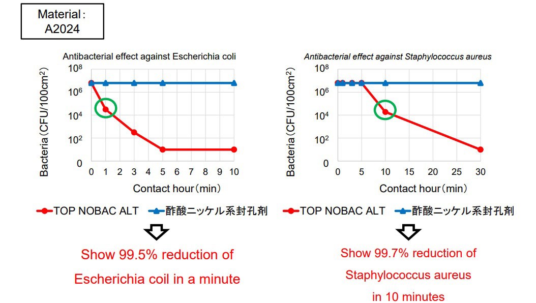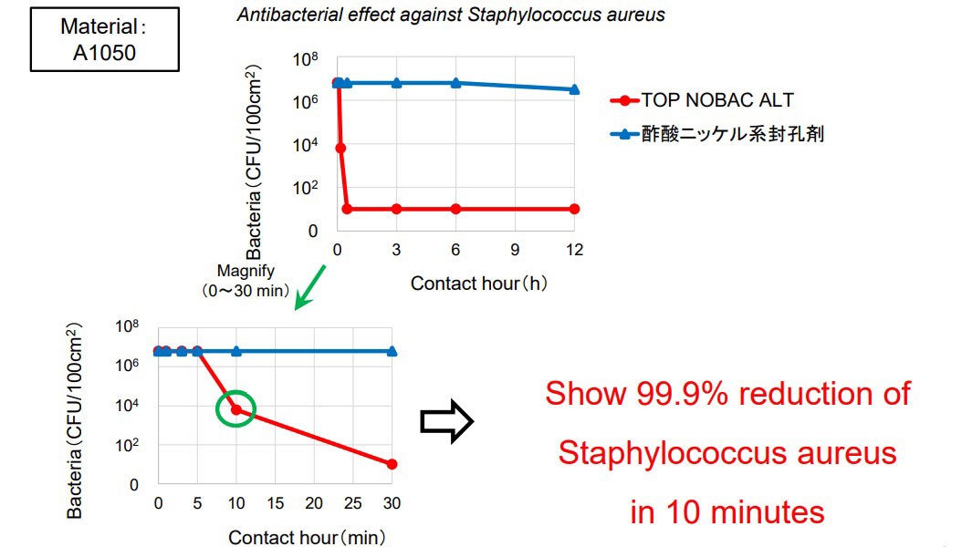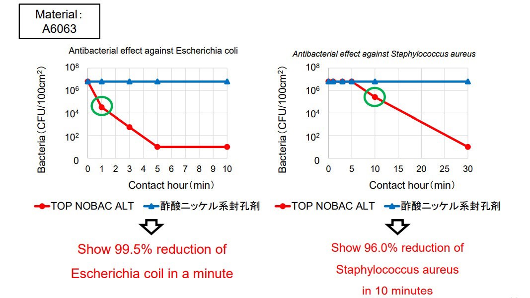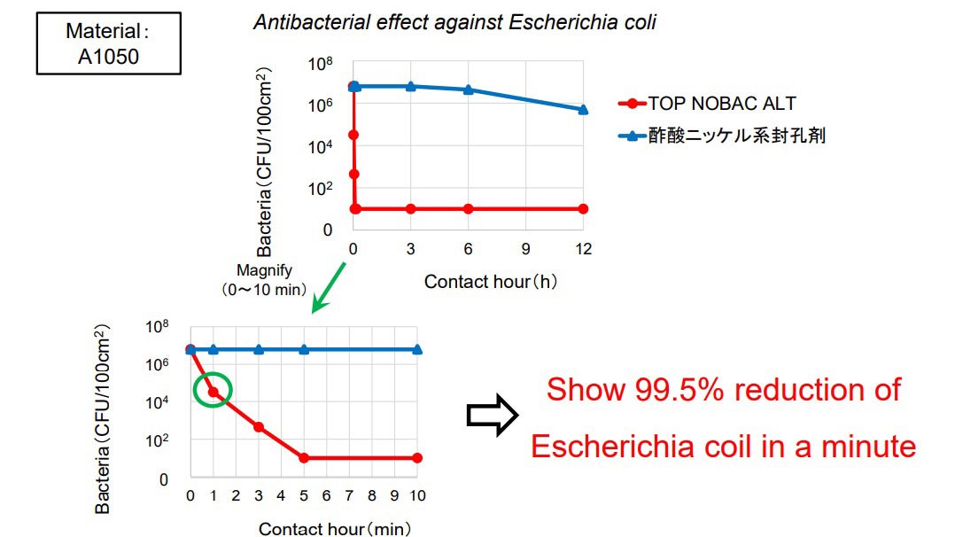 According to the experiment, it was tested on material A1050, A2024, and A6063, and showed dramatically 99.5% reduction of E. coli in 1 minute, while the conductivity performance and color appearance have still achieved. Moreover, after water resistance test, it demonstrated quick effect in reducing bacteria within 16 hours.